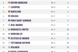 体育资讯2月27日讯 本赛季欧冠淘汰赛抽签结束,以下为数据网站OPTA对欧冠16强做的实力排名。