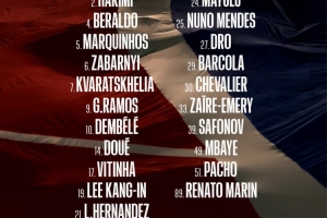 前锋:7-克瓦拉茨赫利亚、9-贡萨洛·拉莫斯、10-登贝莱、14-杜埃、29-巴尔科拉、49-姆巴耶