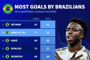 体育资讯2月18日讯 德国转会市场统计了巴西球员在欧冠的进球数量,并列出欧冠历史巴西球员射手榜,内马尔43球居首,维尼修斯31球次席。
