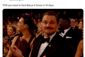 这意味着马竞将在10天内3次对阵巴萨,马竞官方社媒晒出莱昂纳多·迪卡普里奥在奥斯卡颁奖典礼上一脸无奈的照片,配文:“当你不得不在10天内3次对阵巴萨的感受。”